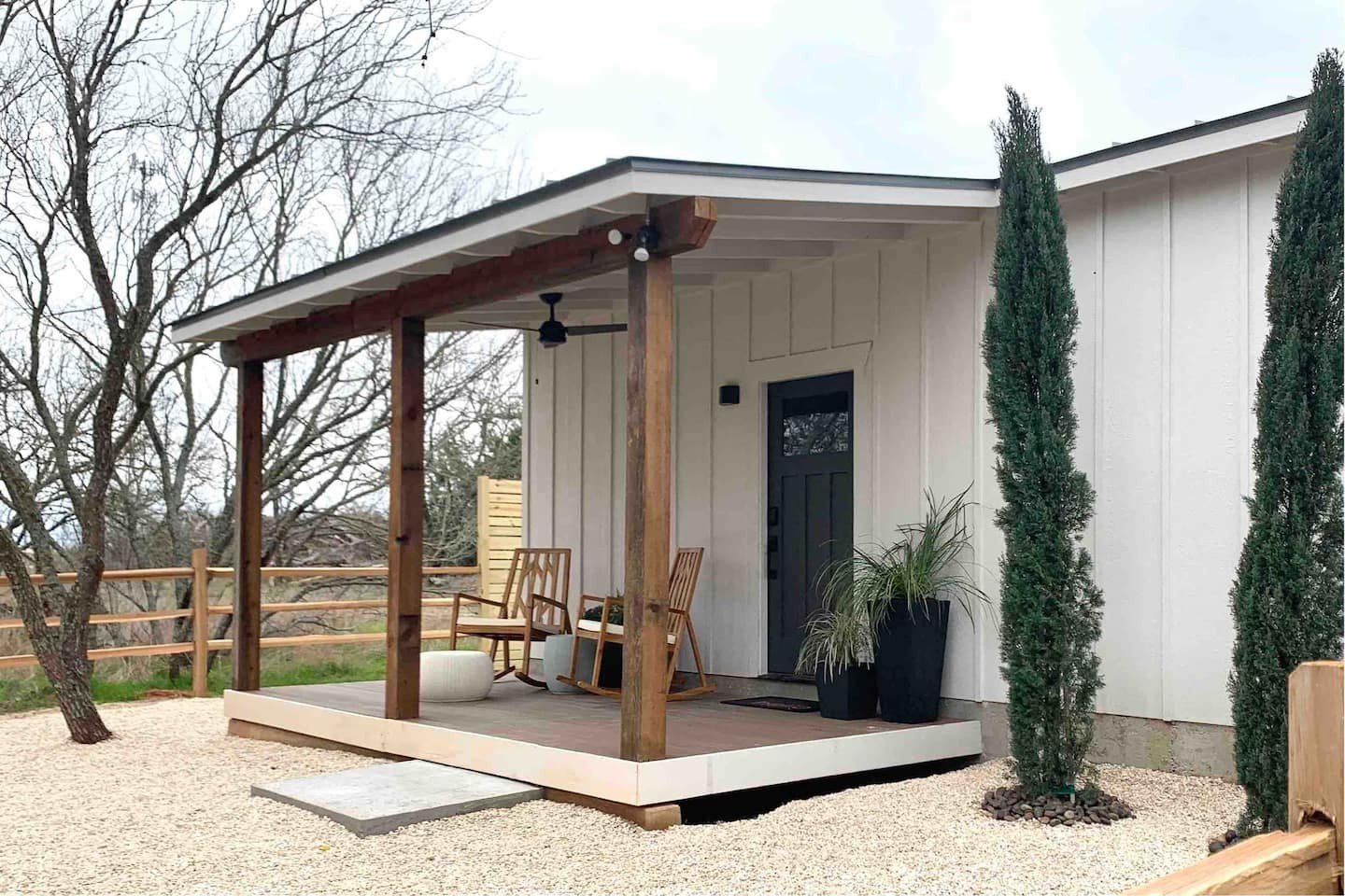 77 Guesthouse is a modern bungalow located just two miles from Fredericksburg's Main Street. Perfect for a couple's getaway, the guesthouse sleeps two, and has one bathroom. There is a 50-inch Smart TV, Alexa speaker, mini fridge, microwave and Keurig. Settle into the rockers on the front porch and watch the deer gaze while sipping on coffee and reading a book.