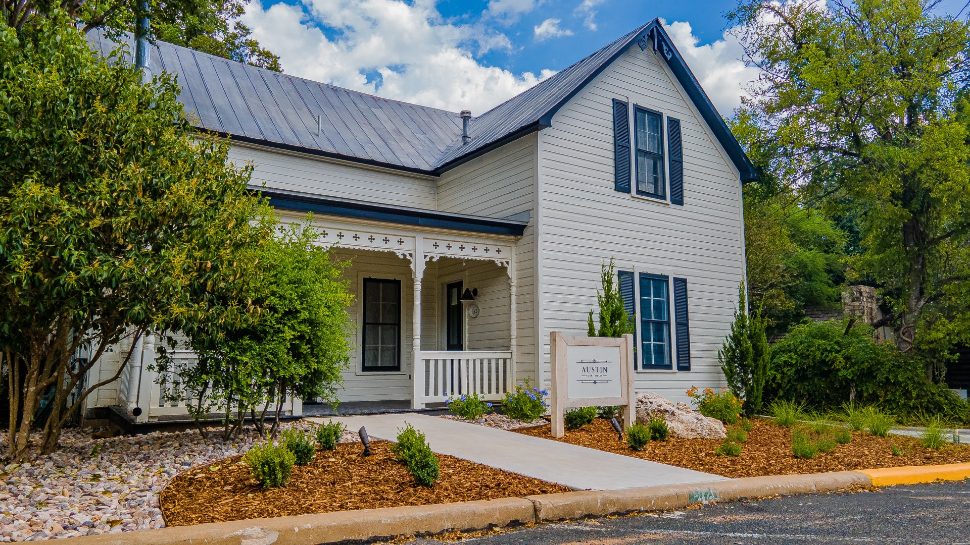 Located one block from the historic Main St, there are six guesthouses at Austin Four Twelve, each are cozy, luxury spaces for couples wanting easy access to all the shopping, wine tasting rooms and restaurants in Fredericksburg. Walk to some of the best local spots then return to a private outdoor space and enjoy a quiet hot tub experience in the evening before another day of exploring. There are six distinct units each designed for 1 or 2 people or rent the entire house to sleep 12 guests. No. 1: A chic studio layout - complete with a plush king bed, seating area, TV and kitchenette. All units boast a walk in shower, jetted tub, and double vanity sinks. For a bit more breathing room, No. 2: A separate bedroom and living space. This unit also includes two TVs and a small breakfast nook for your morning coffee. No. 3: A totally unique lodging experience. With beautiful, vaulted ceiling, a studio-style layout, fireplace and stand-alone tub, perfect for a romantic getaway. The private courtyard with the hot tub is also located on the second story. No. 4: This unit is a studio-style unit with a king size bed, walk-in shower with stand-alone tub, kitchenette, fireplace and private hot tub with outdoor shower. No. 5: This ADA unit can sleep two guests and has a king size bed with walk-in shower. There is a kitchenette, fireplace and private hot tub with outdoor shower. No. 6: This is an upstairs unit with a treehouse feel courtyard. There is a king size bed with walk-in shower and jetted tub, kitchenette, fireplace and hot tub.