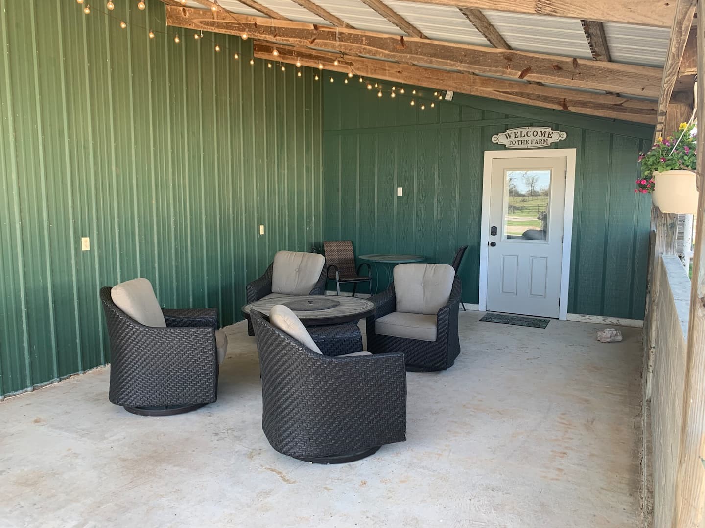 Barnside Hangout is a studio that has two rooms, including the living area, kitchenette, bathroom and bedroom. There is a king bed and a sleeper sofa, accommodating a total of four guests. The outdoor seating area includes a fire pit. Owners may be onsite to check livestock. Guests are welcome to walk and sit at the tank but are asked to stay on the main road of the property.
