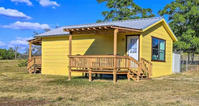 This inviting vacation rental located just outside of Fredericksburg sits on the Bear Creek Road bike route and offers a warm and welcoming interior with a well-equipped kitchen, 2 decks (one covered), and panoramic views of the ranch surrounding the cabin.