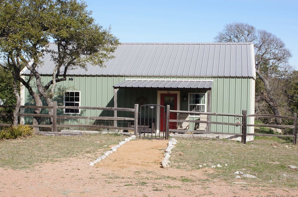 Get away from it all at the Big Sky Guest House, a rustic metal roofed guest house. Located 15 miles from Downtown Fredericksburg, Big Sky Guest House is the perfect spot to get away from the stress of everyday life. The only traffic jam you'll experience here is when the local cows, goats, or sheep decide the grass really is greener on the other side! Bring your telescope or your camera to enjoy a night sky unspoiled by the lights of the big city, or just sit out on the front porch with the beverage of your choice and drink it in with your eyes. In the morning, enjoy a cup of coffee or tea on the back landing while you watch the sun come up to the sounds of nature and feel your stress melt away. The Big Sky Guest House is located on a 28-acre ranch with two resident Texas Longhorns. Other wildlife you may see: hawks, humming birds, painted buntings and other songbirds, wild turkeys, white tailed deer, fox, and armadillos. You'll also see and hear the not-so-wild goats, sheep, cows, llamas, and donkeys on neighboring ranches. Two bedrooms and one bathroom sleep up to 6 guests.