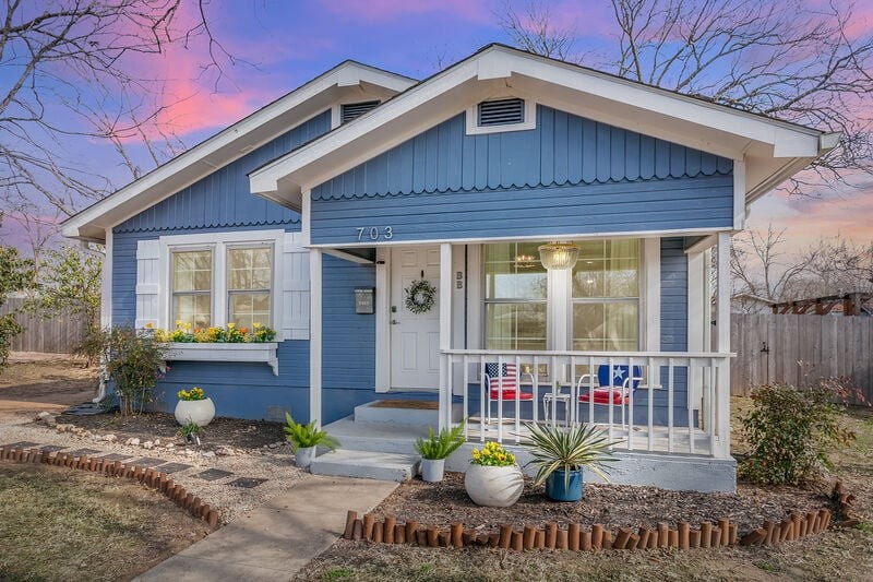 Blue Bungalow is a charming, cozy bungalow is just what you've been looking for. Inside, you'll find a full kitchen with a drip coffee pot, breakfast bar seating, and wine bar, plus a cozy living area with plenty of seating for everyone. The laundry room with full size washer & dryer is an added bonus, making this home the perfect combination of cute and convenient. Also in the home are bedrooms, each with king size beds and their own en-suite bathrooms. The backyard is an entertainer's dream, with a seating area around the fire pit, rope lighting, a miniature putt-putt course and other yard games, and plenty of seating underneath majestic Texas oaks. Additionally, this home is conveniently located, just 5 blocks from Main St. and everything Fredericksburg has to offer. Sleeps 4.