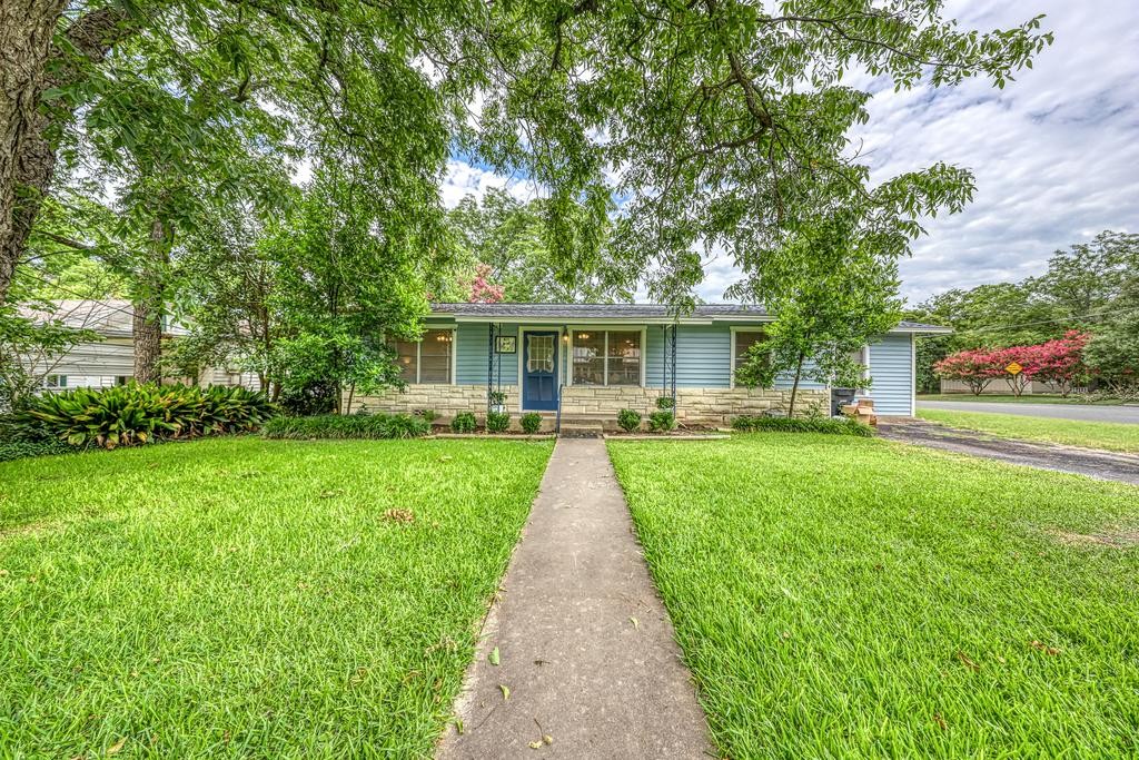 Bluebonnet House is an elegant ranch home on a quiet corner that sleeps eight with three bedrroms and two bathrooms. Renovated in 2021, the home has a large backyard and a screened-in porch. The front doors open to bright and welcoming living and dining areas. Wood floors are found throughout the house. There are two arm chairs and a sofa that surround a coffee table that face a large TV. The spacious dining room has seating for four. The full suite of stainless steel appliances make up the kitchen along with barstool seating for two. The primary suite has a king size bed, flat screen TV and ensuite bathroom with a step-in shower. The second bedroom has a queen bed and the third bedroom has two twin beds. There is an additional bathroom. The cozy backyard includes a screened-in porch, wood deck with built-in bench and a fire pit. Pet friendly with fenced in yard.