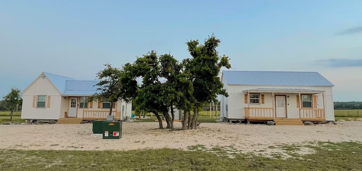 Canjun Condo and Gumbo Getaway are two cabins located 15 minutes from Main Street. in Fredericksburg Both cabins were built in 2021. Both cabins can sleep four guests, with a king-size bed and a sofa bed. There is one bathroom in each cabin. There is a full kitchen in each. Outside, there are two seating areas with fire pits.