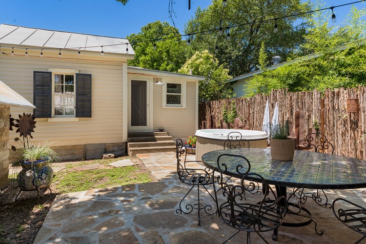 Calmbach Cottage in Fredericksburg, Texas is a two bedroom house with full kitchen that is great for a family of four or for a few friends. The backyard is private and cozy with a hot tub, seating and a fire pit.