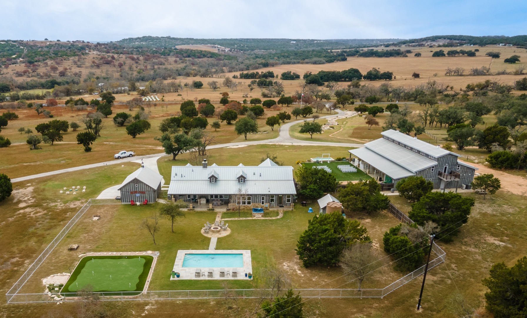 Camp Hideaway in Fredericksburg is located five minutes from the Hill Country Wine Trail and Luckenbach Texas and 10 minutes from downtown Fredericksburg. The modern farmhouse-inspired event center has a main hall with tall ceilings and light and white décor. The beautiful succulent garden situated north of the main hall provides space for photo opportunities. The sliding glass walls of the center open to a covered terrace and outdoor lounge area. The venue also has a designated lawn with a fountain and views of the Hill Country, which can host ceremonies or receptions. Rehearsal dinners based on availability.