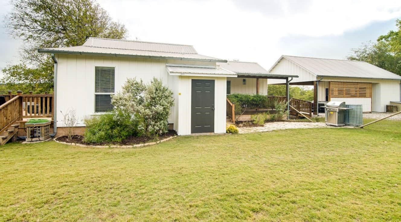 Cedar Haus is a modern, ranch-style guesthouse that is tucked away in a quiet neighborhood seven minutes from Fredericksburg. This two bedroom, two-bathroom unit includes several indoor and outdoor amenities and living spaces. The master bedroom features a king-size bed with a reading chair, walk-in closet and private bathroom. An additional bedroom can be used for an additional fee and includes a queen-size bed and private bathroom. The kitchen comes fully-equipped including complimentary local coffee. The living room has a sectional sofa and chair and TV. Outside, there is a wrap-around porch with rocking chairs, a porch swing, gas fire put and pavilion with hot tub.