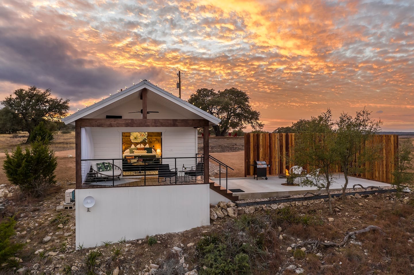 Cresta de Fuego offers two tiny houses located north of Fredericksburg, near Willow City. The tiny houses sleep two guests each and include one bed and one bathroom. Both offer spectacular views from the front porch. Both spaces are equipped with spacious kitchens and walk-in showers as well as washer and dryers, WiFi and free parking. Oversized TV's are included inside and outside the property. Guests can sit by the fire pit and watch deer come to the feeders.