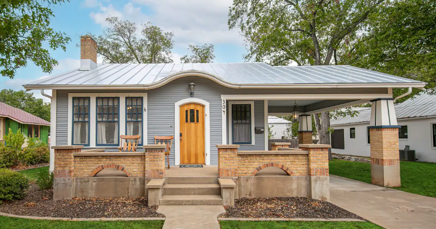 Relax after a day on the town in this 1940s craftsman bungalow. Located just blocks off Main St. you can be in the action with a short walk or drive but also take a stroll on our quiet street or sip on wine and hang out in the large backyard. Each of the four bedrooms feature a king size bed and there is an additional queen size pullout couch in the back sitting room, accommodating up to 10 guests. There is a full size kitchen. In the backyard, there is fully fenced yard with outdoor dining area and hot tub.