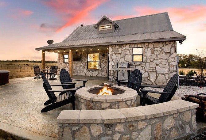 Das Steinhaus is an inviting home for couples, families, and groups located just minutes from Fredericksburg and Luckenbach Texas. The three bedroom, two bath home features a porch that offers a view of the cattle and horses in the pasture. Apart from the comfortable sleeping accommodations, the house also has a hot tub, swimming pool, outdoor stone fire pit, outdoor television on the patio, indoor fireplace, full kitchen for dining and comfortable lounge area. In the late spring and early summer, guests can pick fruit from the orchard on property.