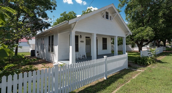 This beautiful 150 year old, one family owned home is just the history you are looking for when you come to stay in Fredericksburg. The two bedrooms both offer king sized beds for your sleeping comfort. There is an adjoining bathroom between the two bedrooms and a second bathroom just off the sun room. The sun room has a day bed which allows this cute home to sleep five. Erna and Elgin's has a full kitchen. The kitchen is fully stocked with dishes, cookware, utensils, refrigerator, oven, stove, coffee maker and microwave if you decide to cook in home. The front porch is nice and wide with two porch swings and chairs to relax in. The back patio has a table with four chairs. Maximum occupancy is 5 guests.