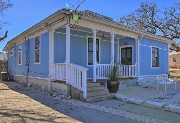 Hale Yeah is a 2-bedroom, 1-bathroom home with an outdoor oasis featuring a bar area, fire pit, foosball table, lounge chairs, and a fenced-in backyard. The pet-friendly property is less than a mile from Main Street in Fredericksburg and has a fully-equipped kitchen, a modern farmhouse interior with room for seven.
