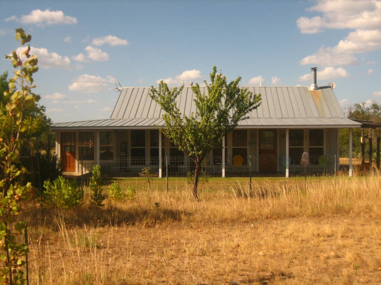Doss is a valley near Fredericksburg nestled among the limestone hills. Hidden Springs Ranch is a sheep ranch with two guesthouses, Wrangler and Foreman. The property has a creek, outdoor patio with smoker, fire pit, and grill, great for groups of up to six. You can rent the two cottages separately, but the best way to enjoy them is together. The cabins have a rustic feel, stained concrete floors, wood beamed ceilings and accents of tin on the walls, yet they are equipped with modern conveniences. When you walk up to the door, each cottage greets you with a long covered porch with comfortable seating. Foreman Cabin: When you step inside you'll be in an open room with living area, dining area, and kitchen. A wood-burning stove at one end of the room adds a charming touch. The separate bedroom has a king bed and bathroom with shower. The screened porch just outside the cabin has an inviting wicker seating area, just waiting for you to relax with a drink after you step out of the hot tub. Sleeps two people. Wrangler Cabin: The door opens into a large room with living area, kitchen and dining area —plus two twin beds, great for kids. A wood-burning stove warms the living area. The separate bedroom with king bed has charming voile curtains hung from willow branches. The bathroom has a shower. Sleeps two people.