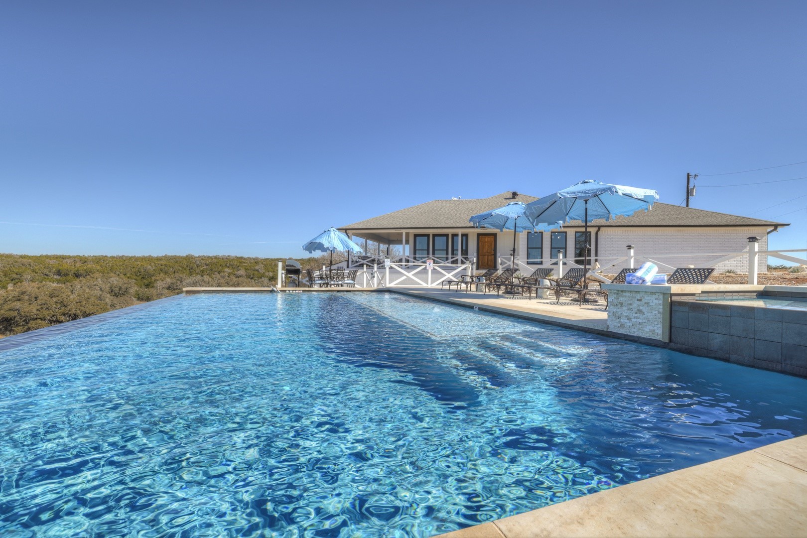 Welcome the Hilltop Hideaway Haus, located just 2 short miles from the heart of downtown Fredericksburg. The home boasts breathtaking Hill Country views, a large infinity edge pool, hot tub, firepit, pool table, and much more. You'll love the views, luxury kitchen, wine fridge, outdoor dining and patio space, and the cozy 5 bedrooms and 4 full bathrooms. Four bedrooms have king beds, and the other has two queen beds. You'll love the open concept living, stunning views, exceptional indoor and outdoor dining spaces, a new kitchen with brand new appliances, TV and surround sound system by Polk premium audio, making this home perfect for entertaining and socializing for large groups and families. The kitchen comes fully stocked with plateware, flatware, serving platters, glassware including wine and whiskey glasses galore, and other little necessities for those wishing to dine in. The outdoor space is ideal for gatherings and boasts an 8-seater hot tub, 10-seater dining table, propane gas grill, and 12-seater outdoor fire pit area. For those staying longer, a washer and dryer are available. Parking is available for up to 4 vehicles privately.