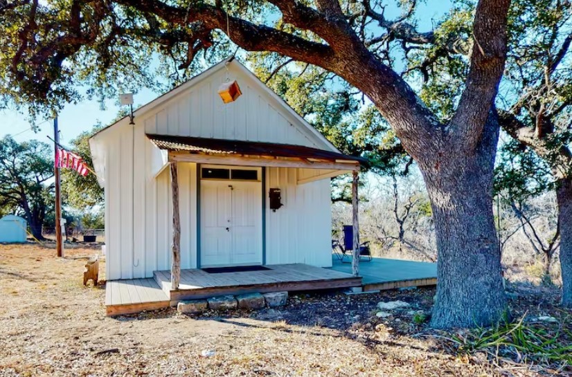 Brush up on your Fredericksburg history in this delightful studio retreat, Honey Creek School House. Originally serving as a Gillespie County country schoolhouse, circa 1885, this unique home comes thoughtfully refurbished and equipped to offer a modern escape for couples exploring the Texas Hill Country. Enjoy easy access to great local wineries while indulging in your own private slice of country paradise. Sprawl out in the spacious yard while enjoying a few rounds of cornhole or lounge on the furnished deck beneath the shade of mature oaks. Fire up the gas grill for a true, Texas-style barbecue. The open interior comes beautifully furnished with updated furnishings and in-home essentials including wall-mounted A/C and free WiFi. A well-equipped kitchenette features a 3/4-size Galanz fridge, full-size stove/oven, microwave, coffee maker and sink. Enjoy meals at the high-top dining counter with seating for three and afterward, relax in the plush leather furniture and open a bottle of wine while enjoying a movie night on the wall-mounted flatscreen TV. Sleeps 2.