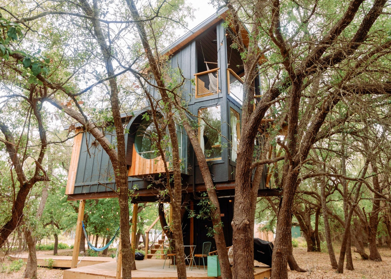 HoneyTree features five luxury treehouses on 10 acres of scenic Texas Hill Country land overlooking Palo Alto Creek. Located only eight minutes from Main Street in Fredericksburg, Acorn, Leaf, Live Oak, Sapling and Sycamore Treehouses feature huge windows, spectacular views, walk-in rain showers, full size soak tubs, and kitchens with well-appointed cooktops, apartment sized fridge and freezer, microwave and Keurig, cookware, etc. Babies and small children are welcome!