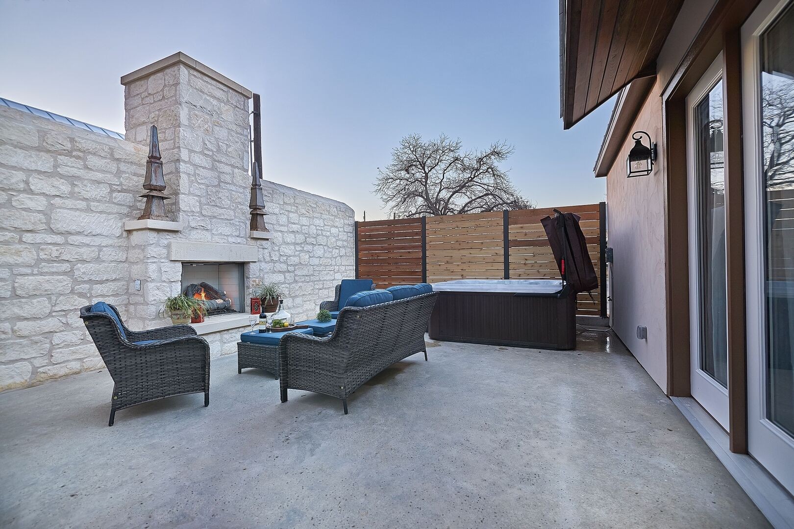 The In Town Villas on Austin are four suites (Suites 3, 4, 5 & 6), which each have their own king bed, and a separate additional bedroom, which can be entered from either Suite 3 or 4, that also has a king bed. These can be rented together or separately. There are four full bathrooms (one in each suite) that all feature large walk-in showers. Suites 3, 5, and 6 all have kitchenettes (with Keurigs, small refrigerators, and microwaves), while Suite 4 has a full kitchen (full-size refrigerator, stove and oven, microwave, and Keurig). Each suite features a 65" Smart TV, WiFi, indoor gas fireplaces in Suites 3, 4, and 5. All suites have private courtyards with a Jacuzzi tub, Suites 4 and 5 have outdoor gas fireplaces and outdoor seating. All suites are walking distance to shops, restaurants, tasting rooms, art galleries & museums. No infants, children or pets allowed.