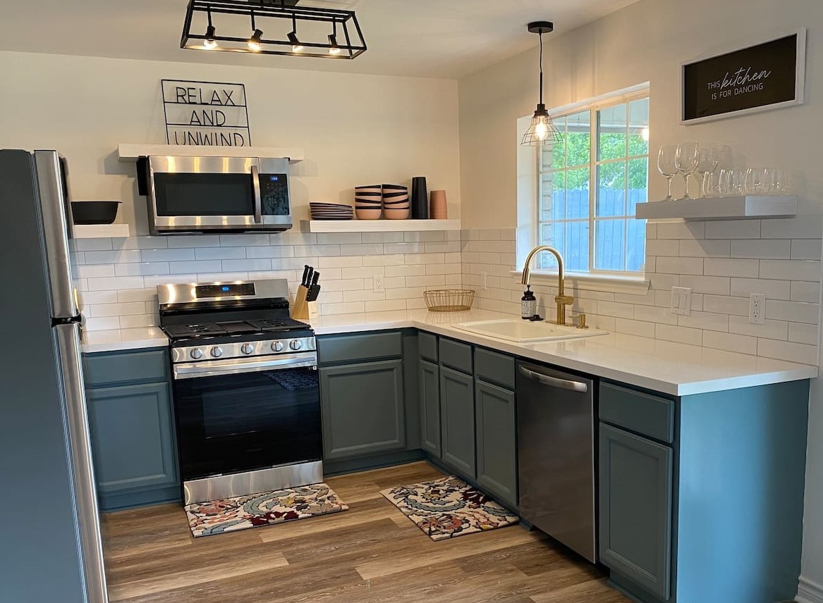 Just Peachy is a spacious three bedroom, two bathroom home with a hot tub and private fenced backyard. Each bedroom has a king size bed. The kitchen has a coffee pot, crockpot, baking dishes, pots and pans, utensils, wine glasses and beer mugs. No pets.