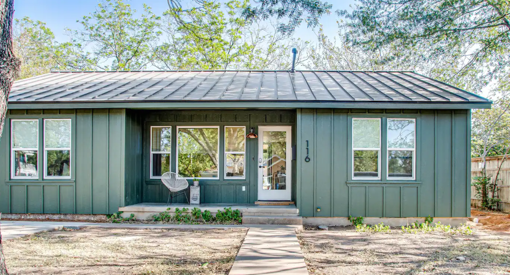 Koselig Hus is the epitome of a romantic getaway for weddings, wine tasting, girls' retreats and Texas Hill Country living. Located close to Fredericksburg's Main Street and Marktplatz, this home is perfect for festival goers and travelers looking for the local vibe, as well as those seeking a quiet escape. The space has been freshly renovated in conjunction with an acclaimed interior designer, creating relaxed spaces that are simultaneously luxurious and laid back for your home base. This cozy oasis has warm wood floors and soft wool rugs, and is flooded with light throughout. The stylish interiors are equally as comfortable as they are beautiful and meant to give rest and fun for guests. Your every desire has been anticipated, including a bath tub, Frame TV, dedicated work space and washer/dryer. The kitchen with its white cabinets, quartz countertops, stainless appliances and island with bar stools, is as well-outfitted as yours at home and fit for several days stay. A large assortment of small appliances, pots and pans, knives, table linens, a full set of spices and even a chef’s apron are at your disposal. Koselig Hus (thus named because 'Koselig' is the Norwegian word for ‘hygge’ which means ‘cozy’) can comfortably sleep 6 guests in three bedrooms, each furnished with a designer king-sized bed and all the creature comforts any traveler can imagine. Start your morning off right with a cup of French-pressed coffee or a quick cup from the Keurig at the coffee bar. For non-coffee drinkers, choose from a selection of teas. Gather your family and friends around the large, round dining table with eight chairs to share a meal, enjoy conversations and to play some of the many games provided and you will end up creating memories and experiences that will last a lifetime. The disappearing glass wall opens to extend the interior spaces to the covered porch out back where guests can swing in hanging chairs, sit by the fire pit or take a dip in the Cowboy Pool, then rinse off in the outdoor shower. Need to give your car a charge while you’re relaxing or playing? The home includes an EV charger on the left side of the house.