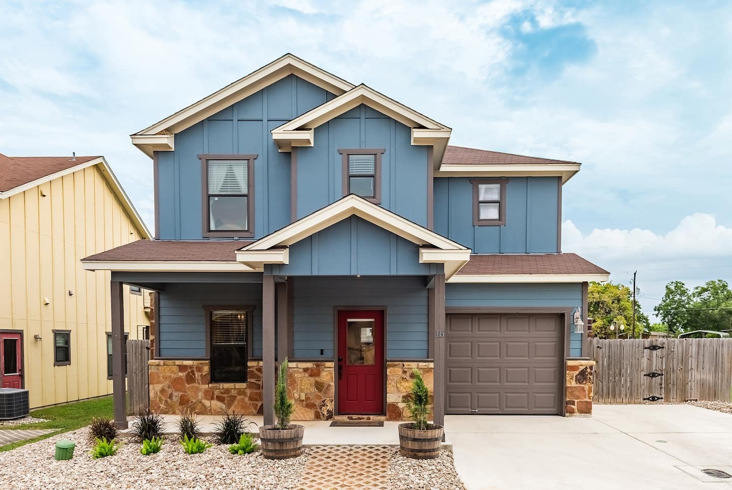 La Maison Bleue is a 3-bedroom, 2.5 bath home that was renovated in 2021 to create spacious, light entertainment space. The master has a king bed with an en-suite bathroom. The second bedroom has a queen bed that is designed after Claude Monet's impressionist paintings. The third bedroom is Van-Gogh inspired and has a twin bunk bed and a separate single twin bed. The kitchen comes fully-equipped with a coffee maker, utensils and cookware, everything you need to prepare light snacks, fancy drinks or a big meal. The living area has a fancy sofa and lounge chair seating. Watch a movie or browse 100s of channels through the Roku Smart TV. Outside, the fenced-in yard features a covered patio with furniture. There is a separate fire pit surrounded by seating.