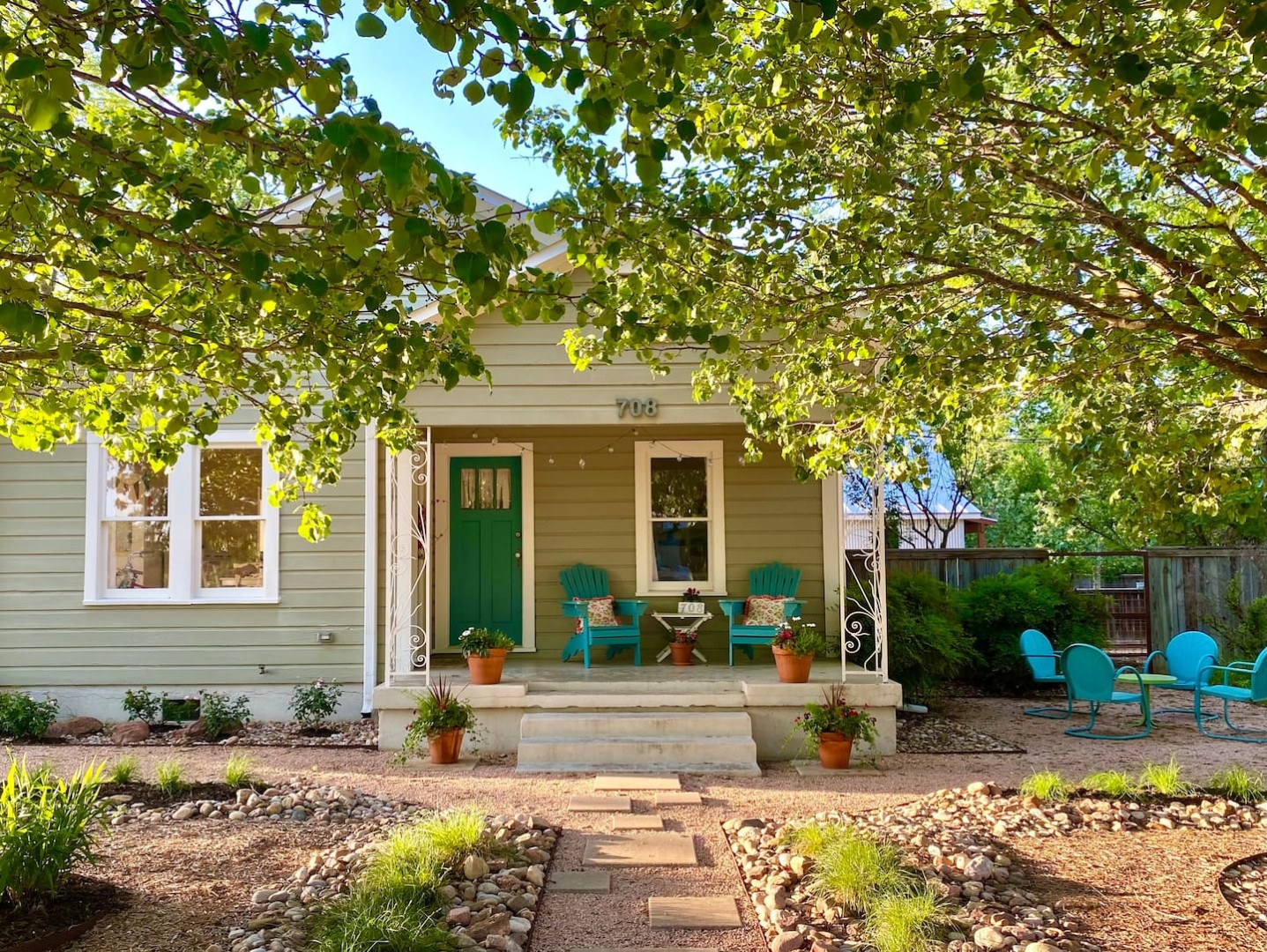 Lykke is the Danish word for happiness and this cozy cottage is full of it. The Lykke House is a 15 minute walk to Main Street and is nestled near pear and pecan trees. If you look closely, you can also find clues from the two boys that called this place home. The home is a two bedroom, two bathroom home that can accommodate six guests. The living room includes a TV and plenty of room to enjoy a glass of wine and read about all that Fredericksburg has to offer. The kitchen is large enough to gather in and there are plenty of stools around the island. Outside there is a charcoal grill, bocce ball and washers. Bikes are also available to tour the area.