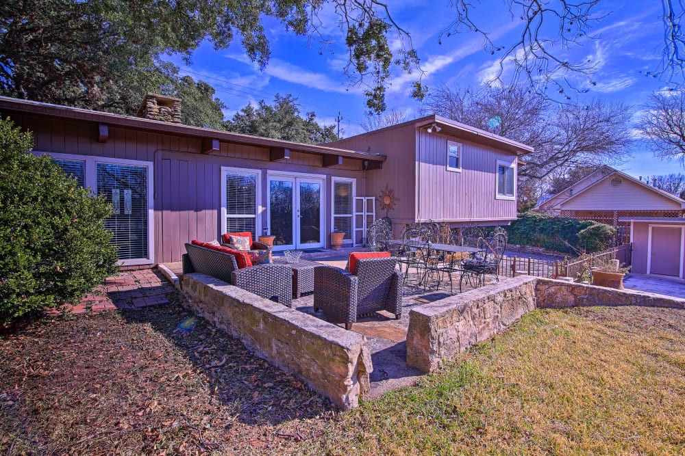 My Happy Place is a beautiful mid-century modern home with private, heated pool, one block from Main St in charming Fredericksburg, TX. This home is built modeling a Frank Lloyd Wright design with elements of the Hill Country incorporated into the structure. This 3 bedroom - split level house has an open kitchen and dining area, large fenced yard with patio & gas grill. This is the ideal vacation rental for families & large groups as it can sleep up to eight guests.