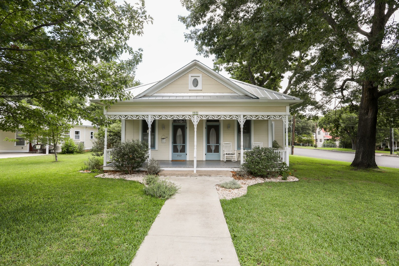 Oma Lange's Guesthouse is just one block North of Main Street in the Historic District neighborhood. A swing and two rockers greet guests as they approach this 1920's residence showcasing the two entrance doors, as was the trend during this time period. The door on the left is the entrance into the living room/dining room. The living room offers comfortable seating with it's leather sofa and chair which are placed to enjoy the large screen TV, and the dining room boasts a table for six. The natural wood door and window frames plus beautiful wood floor and stained glass in the transoms above the doors, leaves a feeling of elegance. Four bedrooms and three bathrooms can accommodate up to eight guests.