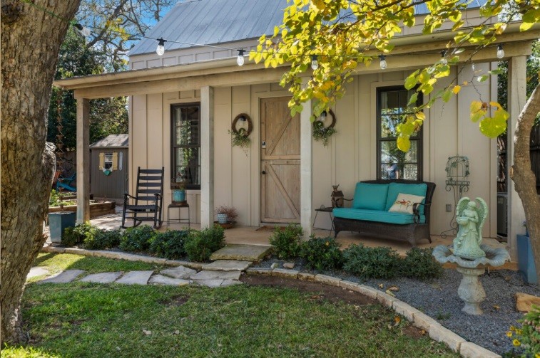 Remmler Nest is a one bedroom, one bathroom bungalow located in a quiet Fredericksburg neighborhood in town. It was recently remodeled and professionally decorated. It features a fully stocked kitchenette, designer linens, comfy living room and gorgeous shower. The back deck area has a table and chairs, plus a private hot tub. There is a pool on the property that can be used by guests but is shared with the property owner. It can host two guests.