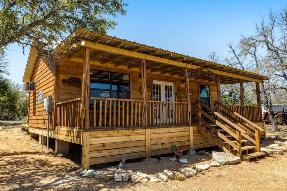 River's SkyView Lodge is a beautifully newly constructed cabin that sits on 11 acres on the hilltop with a million-dollar view overlooking the gorgeous Fredericksburg hills and valleys. It offers a remote location on Flying Ranch, perfect for those who need to get away from it all; however, you are only 14.5 miles from the heart of Fredericksburg. This cabin sleeps four and features an inviting front and back porch to sit and relax on - the gas grill is perfect for warm-weather barbecues with your group. You'll love taking advantage of the hot tub after a day of adventure. When lounging outside, you are welcome to feed the deer some corn if they show up. Inside, you will find a cozy living space with sofas, a TV with DirectTV, and an electric fireplace; a four-person dining table; and a kitchen with all the essentials, including a full-size fridge, stove, oven, microwave, and coffee maker. Enjoy the Crabapple Creek on Kesse Road to sit and relax with beautiful rocks to walk and sit in the water. You're just four miles away from the old General Store/Frontier Outpost - stop by, grab a cold drink and enjoy listening to music on weekend nights.