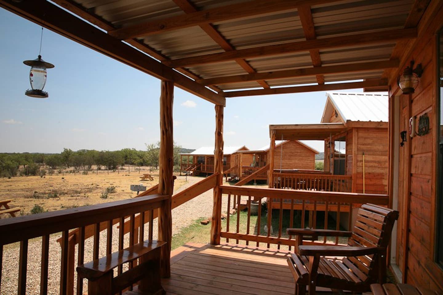 Guests of the Rockview Cabins have a great view of Enchanted Rock. The four charming private cabins (Cabins 1, 2, 4 & 5) at Rockview Cabins were built to take advantage of the great view as all cabins are built to face the famous rock. Each includes a front porch, just perfect for swinging on the porch swing and taking in an unforgettable sunset. Inside the cabins, you are sure to appreciate all the attention to detail. Two cabins offer king size beds and whirlpool tubs. The other two have 2 queen beds each with showers. Rent all four cabins to accommodate 12 guests.