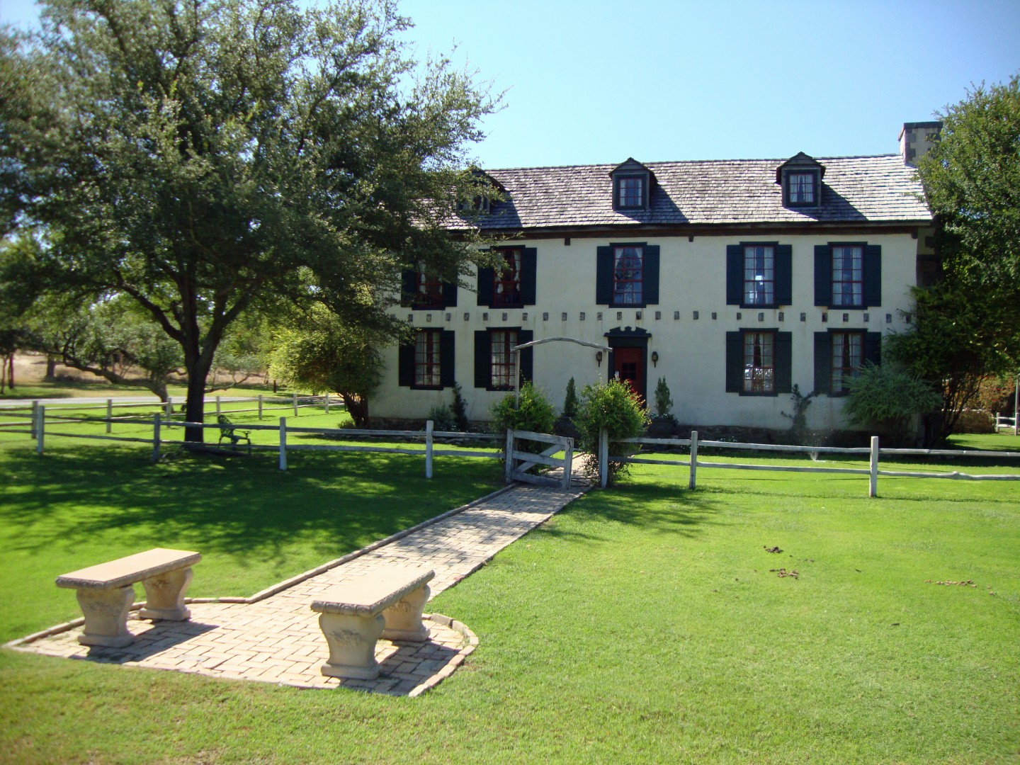 Settlers Crossing's spirit has been captured with articles in many of America's leading magazines. The B&B features seven private historic guest houses with fireplaces and wonderful 18th and 19th century country antiques. Just five minutes from downtown and spread over 35 Texas hill country acres of towering oak trees, rolling pastures and flower gardens, with Settlers creek meandering through. The setting is complete with Brighty the donkey, a flock of sheep, and resident native deer roaming free. Children are always welcome and dogs are welcome with approval. Cottages contain wood burning fireplaces, country antiques, jacuzzi tubs, wonderful outdoor seating areas, and each can be rented for just two or a larger group.