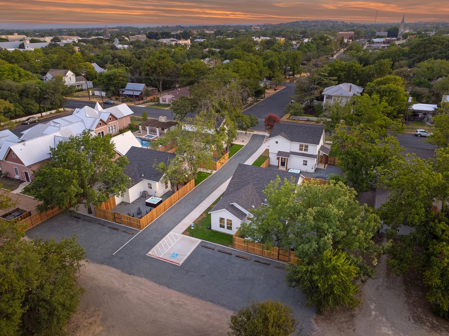 Welcome to Southern Vine, your ultimate vacation retreat. This charming property can comfortably accommodate up to 36 guests across 4 properties, making it perfect for large groups or families. Properties can be rented all together or separately. Located just a short 6-minute walk from the bustling shops and restaurants of Main Street, you'll have easy access to all the local attractions and delights. Each property is equipped with a full kitchen, stainless steel appliances and a large dining table to accommodate the whole group. The bedrooms are appointed with comfortable king and queen sized beds and luxurious linens. Two full bathrooms in each home create space for all to get ready for the day. Each property also has a washer and dryer for convenience. As you venture outside, you'll be greeted by a charming outdoor space where you can soak up the sun and savor the fresh air. Enjoy al fresco dining on the patio, or simply lounge. Indulge in the luxurious hot tub, where you can soak away your cares and embrace pure relaxation. As the evening sets in, gather around the fire pit, creating lasting memories as you share stories.