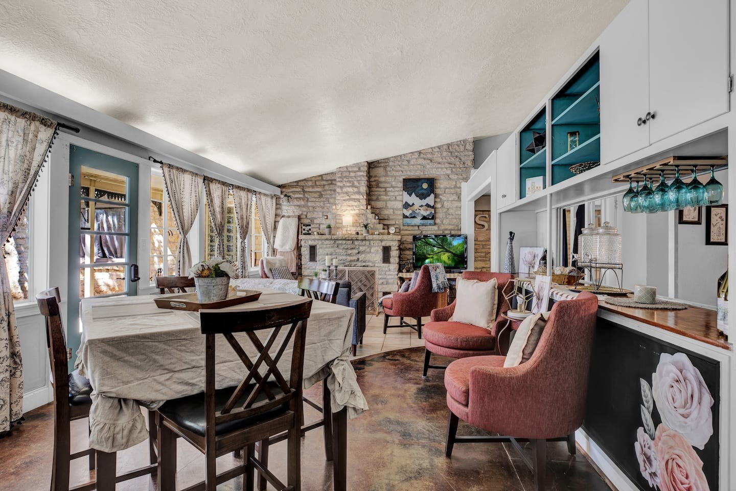 The Spa on Milam has everything you need for a relaxing weekend getaway. The property has two hot tubs and a sauna, perfect for pampering. Less then a mile from town, the property offers peace and quiet. It can sleep seven guests. Bedroom one has a king bed, bedroom two has two double beds, bedroom three has a queen bed and the fourth bedroom has a twin. There are five and a half bathrooms, including a shower room with four shower stalls, three sinks and two toilets. There is a full kitchen.
