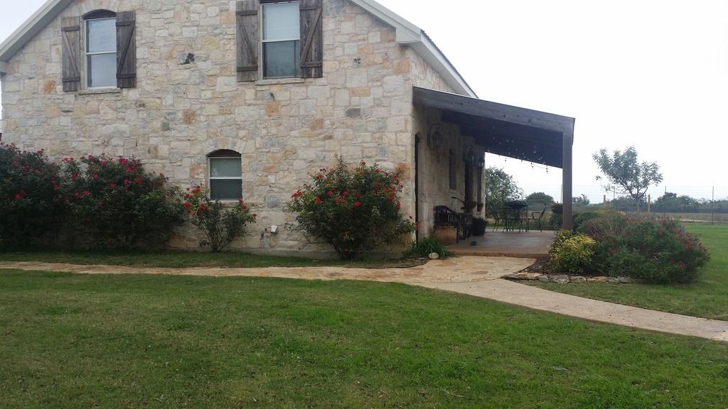 Escape to the Texas Hill Country in a private stone country home. Located only nine miles from Fredericksburg's lively Main Street, this charming home is the perfect place to snuggle up and relax after a day of wine tasting and shopping on Main Street. This cozy home is located on 23 acres with a classic red barn and a neighboring home. On the property you will also find horses, goats, chickens, and a donkey named Taco. Breakfast is furnished for one of your mornings. Chickens Lilli, Coco and Mae will happily provide fresh eggs and you will find biscuits and butter and jelly in the fridge. Enjoy your coffee on the porch and be entertained by the farm animals. The house sleeps 4, there is a king size bed in the master bedroom and a queen pullout futon in the living area and there is one bathroom. Expect to be greeted with a bottle of local wine, a snack tray and fresh sweets to begin your stay in style!