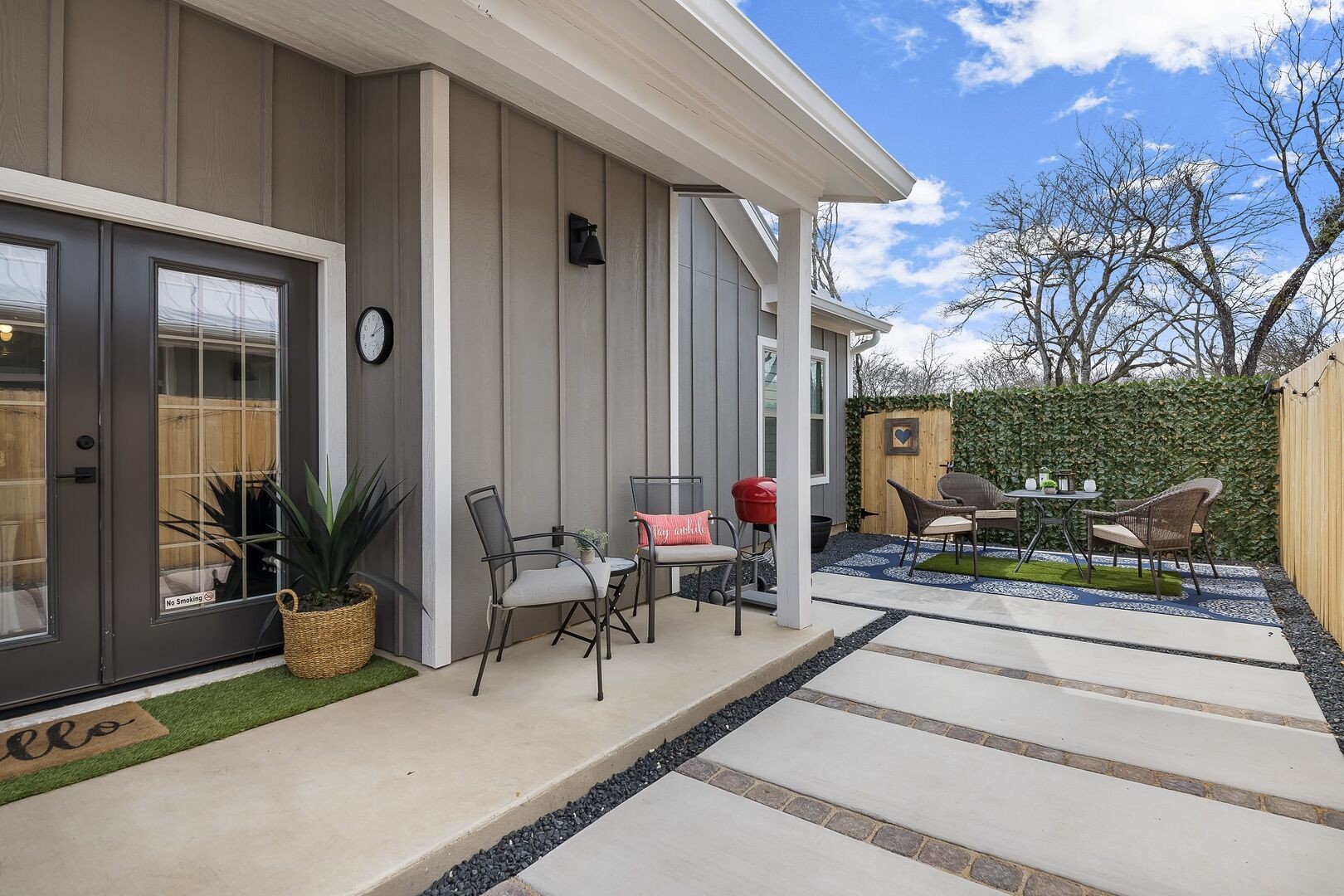 Stay Awhile is the perfect couple's retreat decked out in modern furnishings. The open concept living and dining area combines comfort and luxury and has everything you need to whip up a gourmet meal or enjoy the Smart TV from the comfy sofa. Just outside on the spacious private patio, wind down after a beautiful day in the Hill Country with a glass of wine. The private bath offers upscale finishes and plenty of room to get ready for the day. At night, retreat to the king bedroom adorned with a shiplap accent wall and furnished with crisp white linens. “Stay Awhile” and enjoy all this newly constructed suite has to offer.