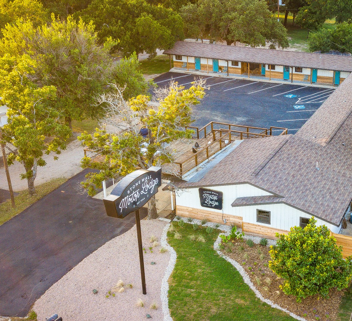 Open now and located on three tree filled acres on Hwy 290 between Fredericksburg and Johnson City, this super cool, retro motel built in the 1960s and has been turned into something spectacular with a full rehab of the property, new furnishings, and a new look. Originally built to house the US Secret Service and Press Corp when Lyndon B Johnson became President, its has been renovated with a nod towards the motels history - a little mid century thrown in a clean, bright modern look. Enjoy a glass of wine in the evening in several public and social areas - a huge upstairs deck, an indoor lounge and coffee bar, and an outdoor seating area under the trees. 12 rooms: one with kitchenette; two handicapped accessible. 4 cabins and 4 RV slots with full hookups are either available now. TV is SmartTV with Netflix provided. Complimentary day passes to Texas Wine Country Jellystone Park's swimming pool.