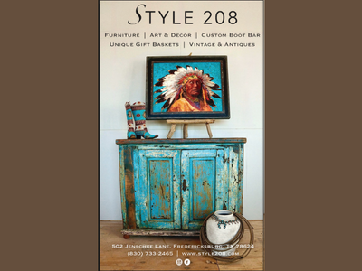 Come browse our beautiful showroom full of rustic elegant furniture, decor, holiday gift baskets, our custom boot bar and more! Ms. Jerilynne Clifford will be signing copies of her Hill Country Cookbook “The Vineyard Table”. Our very talented featured artist, Mr. Eric Fasking, will be here to talk about his 17 masterful works offered in the Style 208 gallery. Wine and bites provided by Whatley Wines. Come shop, sip and mingle. 10% off storewide.