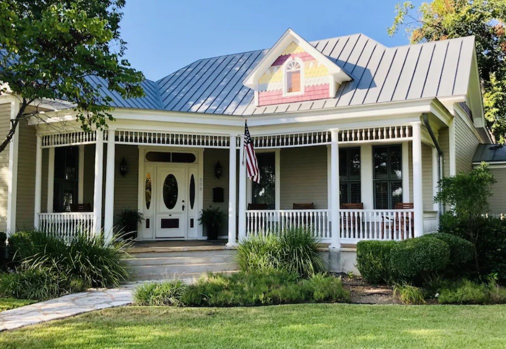 The Painted Lady Estate is a landmark historic home in Fredericksburg, Texas. This home sits on Travis Street and is two blocks away from Main Street. The renovated 1900s home is comprised of five large bedrooms, 3.5 bathrooms and sleeps 14. The home has both formal and informal living areas, a large country kitchen and dining. Outside, the front porch features five rocking chairs, along with an outdoor eating, a new hot tub and a gas fire pit.