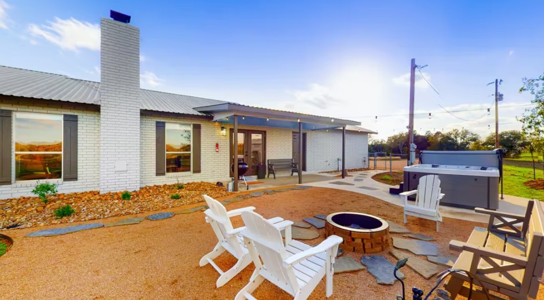 Relaxation awaits at the Vero Ranch House in Fredericksburg. This updated, dog-friendly home includes an expansive patio, hot tub, fire pit and more. Inside, there is room to sleep 12. The primary suite includes a king bed and full bathroom. Three other bedrooms have queen beds and a shared bathroom. The office includes a twin and trundle. The sofa coverts into a full-size bed. The full kitchen has everything needed to prepare a meal and includes dining space for eight.