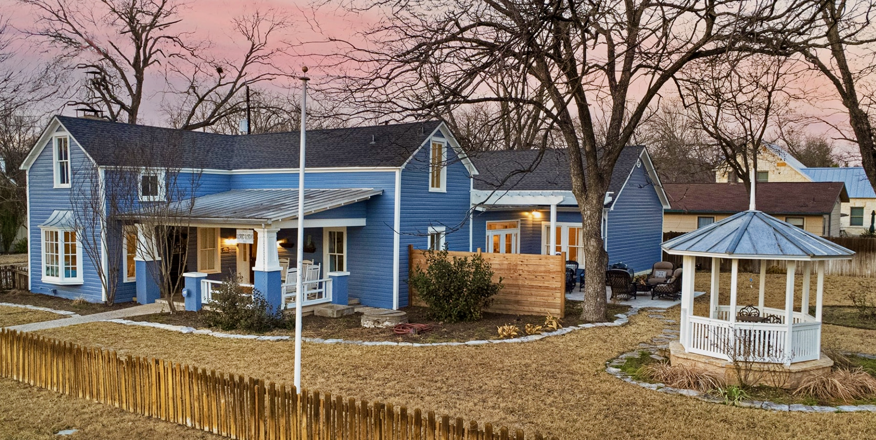 Welcome to Vino Vida, a large German historic bungalow home built in 1925 surrounded by large pecan trees and a fenced in yard, just blocks from Main Street. Sit in the large hot tub, or gather around the fire pit where you often hear live music from nearby Hondo’s on Main. A huge covered front porch and Gazebo invites you into old world charm. In the living room, you’ll find the original wood floors, refinished in 2022. Snuggle up on the couch with a roaring fire and enjoy your favorite shows on a 55” Smart TV with Sonos sound system. In the master suite, guests will find a surround sound music/theater system with plenty of space for you and friends to enjoy. An entire upstairs built in the old German style, with an original clawfoot tub, another king sized bed and two full-sized bunk beds (with one additional roll-out) await guests. Installed in 2022, LED lighting and ceiling fans make for a cozy, comfortable experience. Every bed has ideal reading lights and personal charging stations. Enjoy local wine and meals together at the large butcher block dining table overlooking the back patio, just off the old style fully-furnished kitchen. This adorable kitchen has everything you need, including all stainless steel appliances - two ovens, a large refrigerator, microwave, wine refrigerator, small dishwasher, and plenty of appliances to serve up your favorite meal. (The beautiful large fireplace is no longer in use but was originally used for cooking and heating the house). The garage has a 240V/50A fast charge station, so bring your Tesla or other EV. Vino Vida sits in a quiet neighborhood within walking distance or short drive to coffee shops, restaurants, live music, boutique art and merchant stores, museums, wineries, and the new Grand Central at Milam (two blocks away).