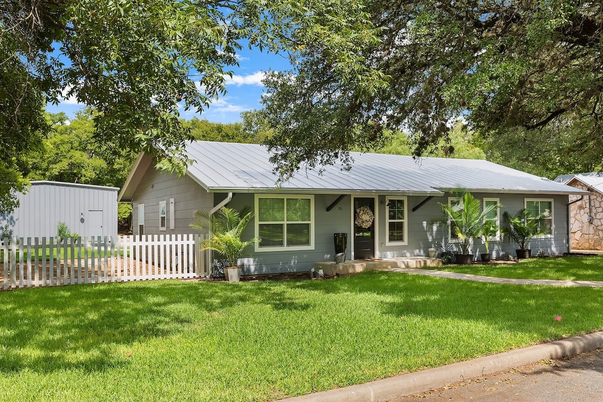 Wasted Cork is a stunning, recently renovated Sunday House nestled on Creek Street in Fredericksburg. Wasted Cork will sleep 8. Each couple will enjoy private rooms with king size beds. You'll love the large outdoor living space with the renovated entertainment barn equipped with a pool table, shuffleboard, cornhole and theater stadium seating. Head outside to relax in the hot tub or hang out around the fire pit. Set back and stream your favorite movie or the big game on the smart TV. Wasted Cork is just minutes away from all that Fredericksburg has to offer.