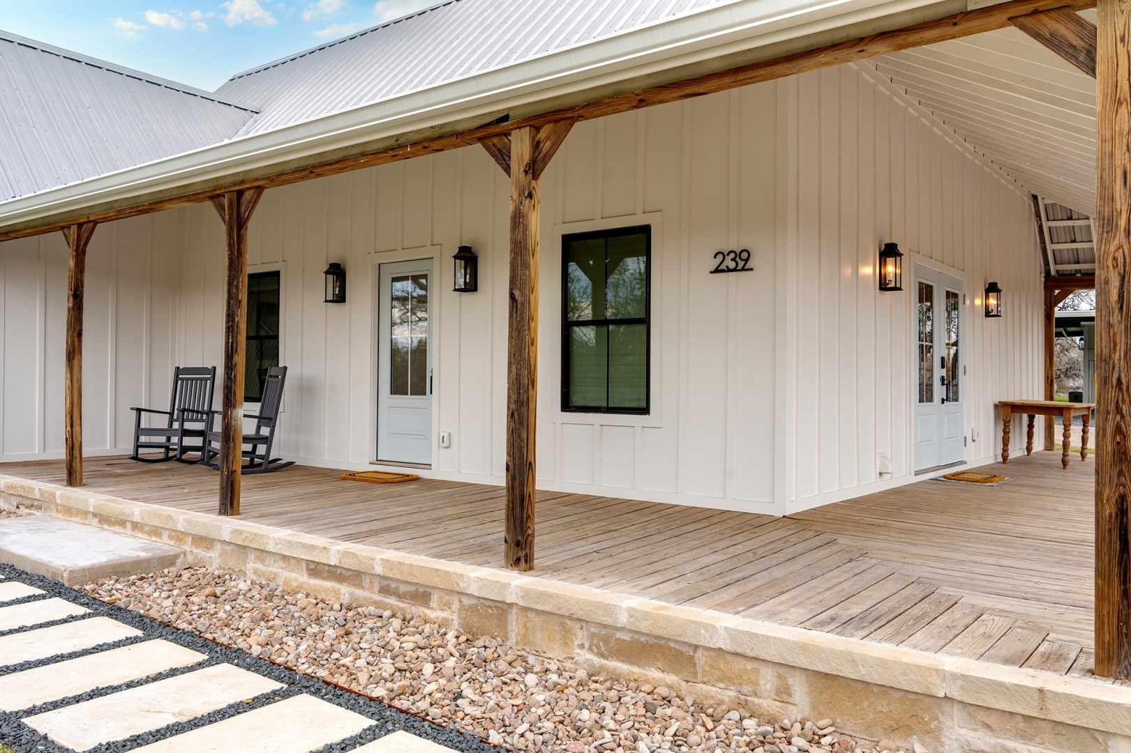 Escape to tranquility at White Oak Haus, a beautiful 3-bedroom 2-bathroom luxury short-term rental in Fredericksburg, Texas. Step into the fully renovated modern farmhouse that has been meticulously crafted to ensure your utmost comfort and relaxation. Whether you are rejuvenating after a day of exploring or prepping for a night of indulgence, White Oak Haus is here for your pleasure. The well-appointed kitchen has all brand new Café’ appliances, marble waterfall countertops and even a nugget style ice maker to enhance your stay. Unwind in the living room with vaulted ceilings, sectional sofa and large 65” Smart TV. Each of the three king bedrooms are elegantly adorned with plush bedding, blackout shades and custom closet organization for your serene ambiance. Embrace the quiet surroundings as you step outside to a new Trex porch dining and extra seating area with built-in lighting. The large wood-burning stone fireplace and a six person hot tub invites you to sink into its warm embrace and let your cares melt away. White Oak Haus is nestled between Main Street and all your favorite winery destinations on Hwy 290. Sleeps 6.