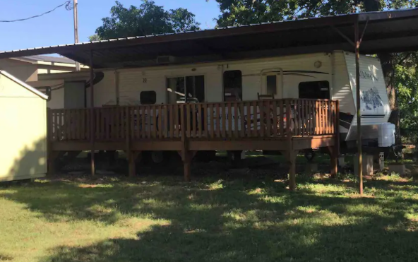 The Wildwood Guest House is a 40-foot permanently parked RV with two bedrooms and a large covered porch with covered parking. It is located 5 minutes from Fredericksburg Main St. and 2 minutes from Pecan Grove Store. Rejuven8 adjustable bed. Child friendly with a play area. Enjoy organic eggs from the owner's hens.