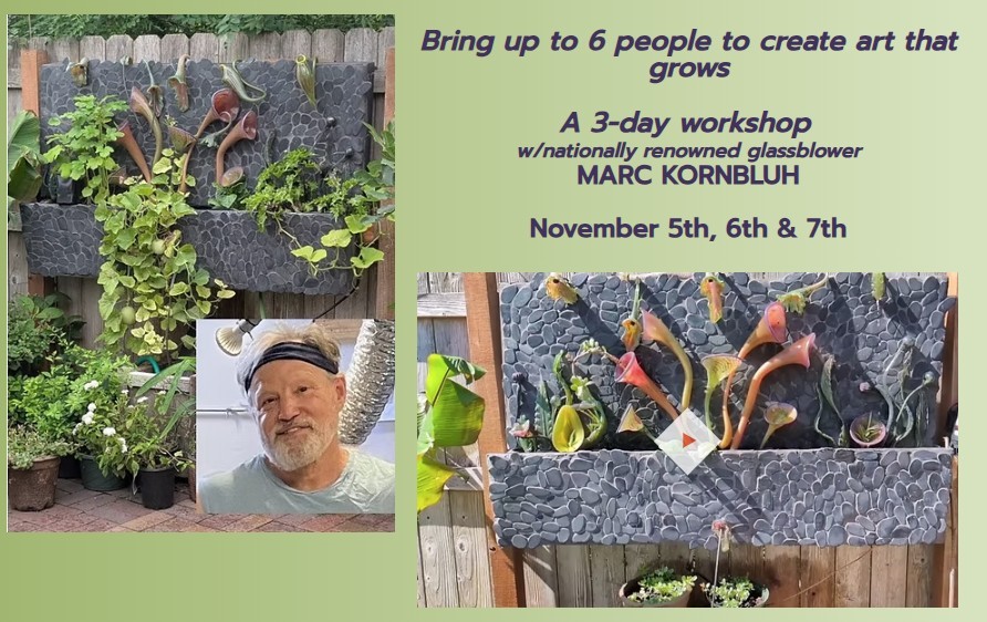 During his visit, Kornbluh will lead a three-day “Build & Blow” workshop (Nov. 5–7), where participants will create their own solar-powered hydroponic planter and blow glass flowers for the built-in fountain. Workshop registration is closed, but observers are welcome to watch and purchase the instructions and order the glass flowers to construct on their own. Pre-registration to observe is required.