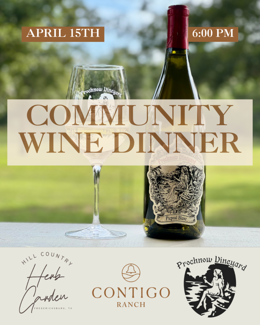 Contigo Ranch Community Wine Dinner Featuring Prochnow Vineyard and Hill Country Herb Garden13454 Lower Crabapple Rd