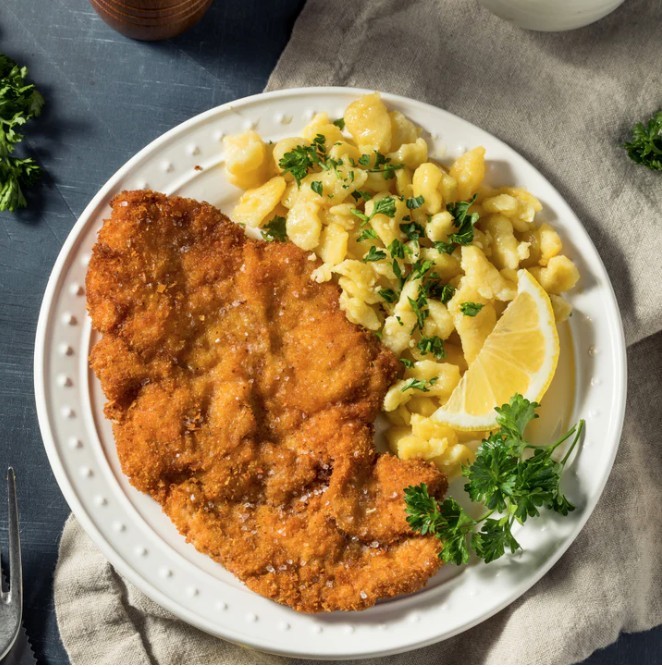 Menu: Hot, Sweet and Sour German Potato Salad, Pork Schnitzel with Jaeger Sauce, Spätzle, Braised Purple Cabbage