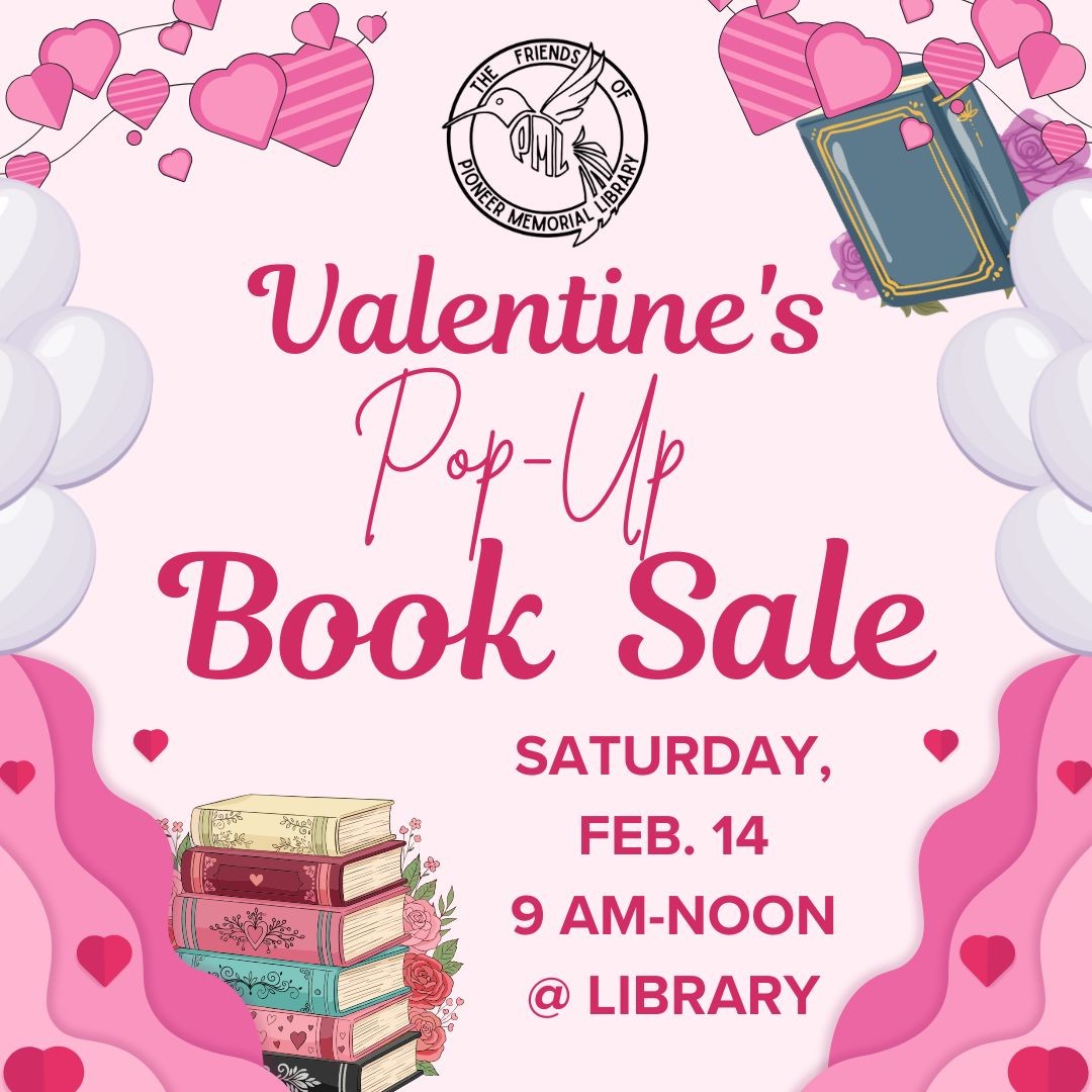 A sweet surprise pop-up book sale at the Pioneer Memorial Library, 115 W. Main St., on Saturday, Feb. 14 from 9-noon. The weather forecast looks promising, so we're bringing out the books for a rare February sidewalk sale. Prices range from $1-$3. Cash or check, please. Hosted by the Friends of the Pioneer Memorial Library organization. Proceeds benefit library programs. Let's make it a date!