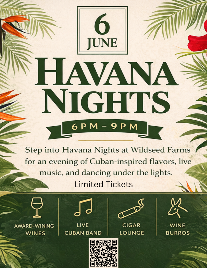 Havana Nights at Wildseed Farms invites guests to experience an unforgettable evening in the Texas Hill Country, filled with Cuban-inspired cuisine, live music, and vibrant energy. Sip award-winning wines, relax in the outdoor cigar lounge, and enjoy the festive atmosphere as dancing and celebration carry into the night. With warm hospitality and a lively setting, it’s a one-of-a-kind event you won’t want to miss.