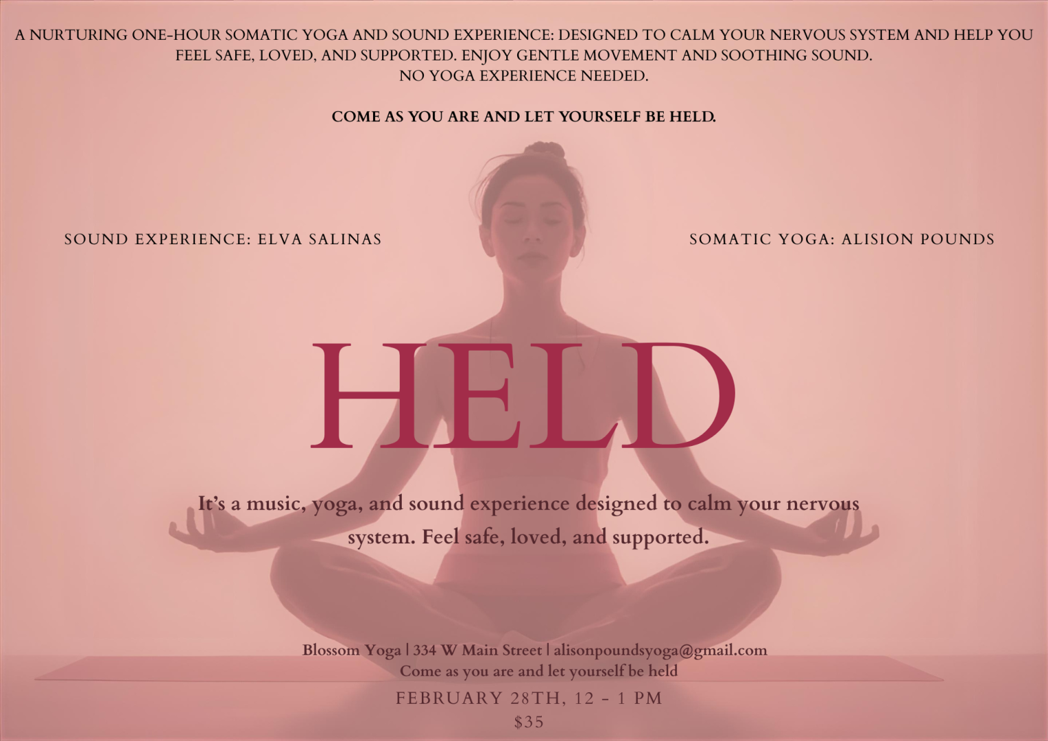HELD is a one-hour somatic yoga and sound experience designed to gently calm the nervous system and invite deep rest. Through slow, intuitive somatic movement and live sound played in resonance with the body, you will be supported in releasing tension, softening effort, and reconnecting with a sense of safety and self-love.