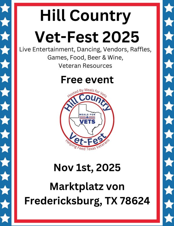 Meals for Vets is excited to announce their second annual fundraising event, Hill Country Vet-Fest. Featuring great food, beer and wine, bounce houses, face painting, tons of raffles, games, vendors, Veteran resources, live music and dancing throughout the day and evening. Come out for a fun-filled free event supporting a great cause. For more information, sponsorship opportunities, or donations, please feel free to contact us at (830) 992-3375 or info@mealsforvets.org.